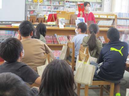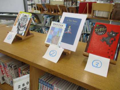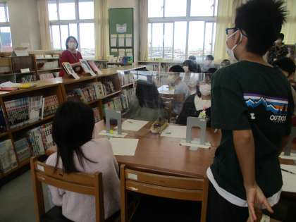 3時間目の図書室です。5年生がビブリオバトルをしています。3人の先生がおすすめの本を紹介し、どの本が1番読みたくなったか投票します。プレゼンテーションの力をつけていきたいと思います。