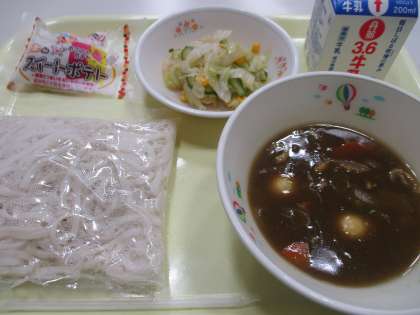 今日の献立は、「うどん・牛乳・カレー南蛮・ボイルドサラダ・スイートポテト」です。自分で、うどんをカレー南蛮に入れて食べます。