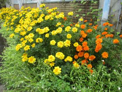 仲よし学級の前の花壇です。マリーゴールドが色鮮やかに咲いています。