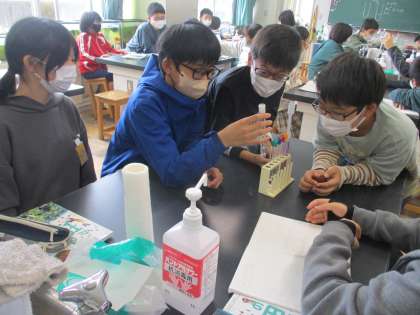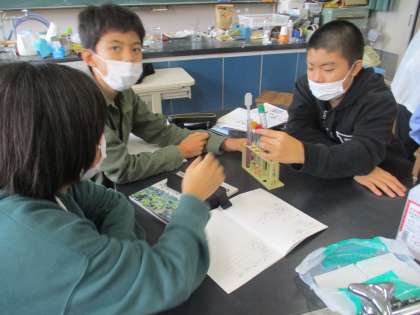 6年生、理科の学習の様子です。グループごとに実験をしています。