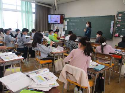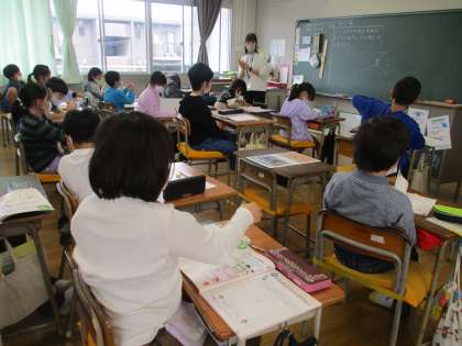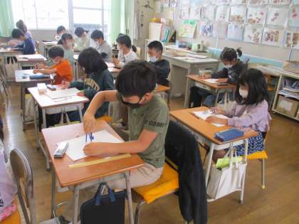 3年生です。4組では、コンパスを使って円を作図しています。初めてなので、なかなか難しいです。