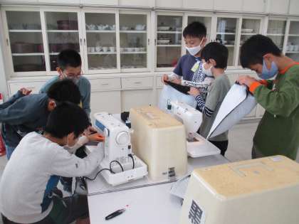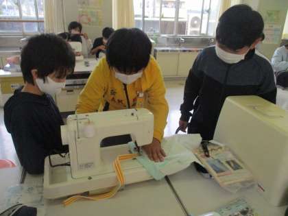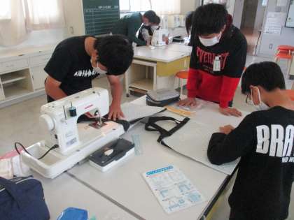 6年生、家庭科の学習です。バッグを作っています。来週の修学旅行に持っていくことができるよう、がんばって作っています。
