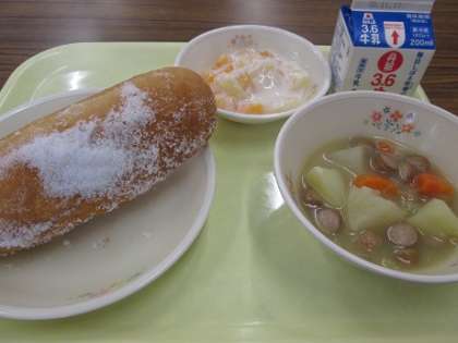 今日の献立は、「揚げパン 牛乳 ウインナーポトフ ヨーグルトサラダ」でした。子どもたちが大好きな揚げパンやポトフが登場し、みんなで美味しくいただきました。