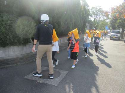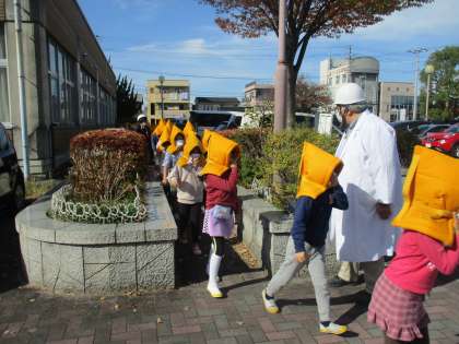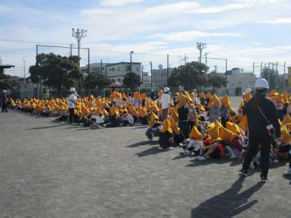 3時間目に、全校で火災の避難訓練を行いました。給食室から火が出ていることを想定し、各教室から運動場へ、静かに素早く避難することができました。煙を吸わないようハンカチをしっかり口と鼻にあてて避難する姿が見られました。また、4時間目には、消防署の方の指導による煙体験を6年生が行いました。煙で全く前が見えない中、手で壁を触りながら、出口を見つけることができました。