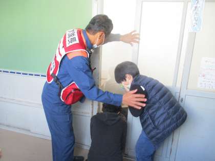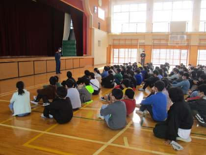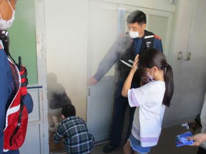 3時間目に、全校で火災の避難訓練を行いました。給食室から火が出ていることを想定し、各教室から運動場へ、静かに素早く避難することができました。煙を吸わないようハンカチをしっかり口と鼻にあてて避難する姿が見られました。また、4時間目には、消防署の方の指導による煙体験を6年生が行いました。煙で全く前が見えない中、手で壁を触りながら、出口を見つけることができました。