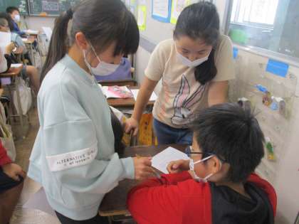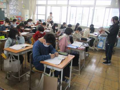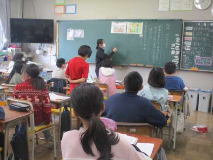 5時間目の5年2組です。教育実習生による道徳の授業です。子どもたちがたくさん発表をしています。