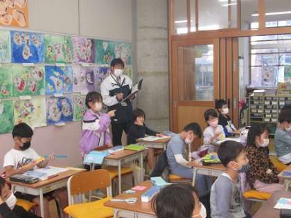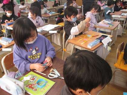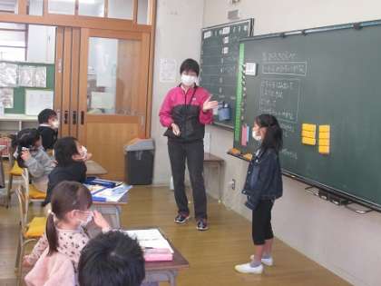 1年生の学習の様子です。算数では「ひろさくらべ」について理解を深めています。2つの異なる形の広さを比べるにはどうしたらよいのか、みんなで考えていきます。
