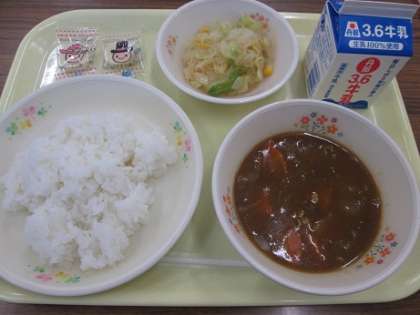 今日の献立は、「米飯 牛乳 ポークカレー シルバーサラダ チーズ」でした。子どもたちの大好きな献立で美味しくいただきました。
