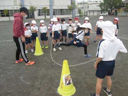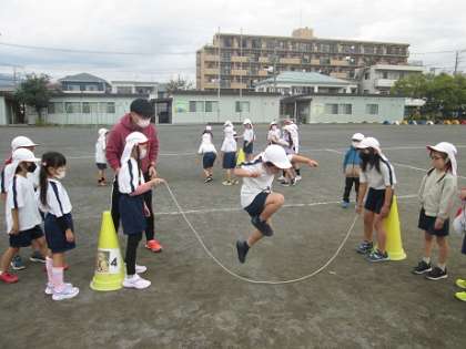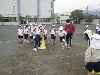 1年生の学習の様子です。体育では長縄にチャレンジしました。みんな上手に跳んでいました。