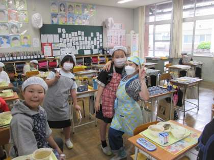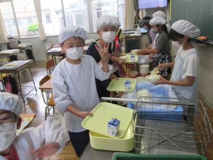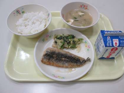 今日の献立は、いわしの蒲焼き、ごま和え、豆腐とじゃが芋のみそ汁でした。