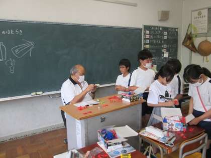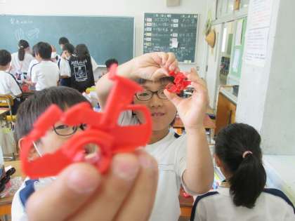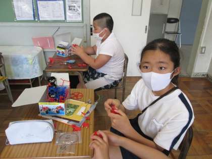 理科の授業では「電池のはたらき」で、スイッチの部分を組み立てていました。この赤い部品がスイッチになるのだと教えてくれました。電池の働きについて、興味を持って学んでいます。