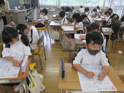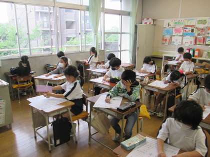 2年生では「たし算のひっ算」のテストをやっているクラスがありました。みんな、真剣に問題に取り組んでいます。