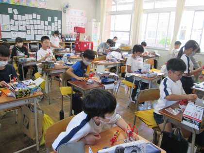 理科の授業です。実際に電池をつないでモーターを回しています。電流の流れの学習をしています。