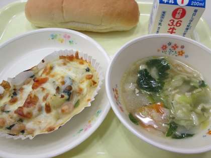 今日の給食は、ポテトグラタン、ベーコンと野菜のスープ、ロールパンです。