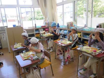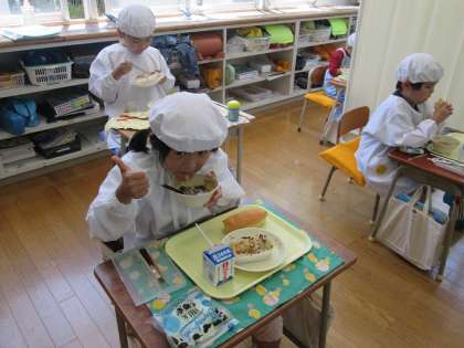 なかよしのクラスでは、みんな、静かに給食を食べていました。「いいね」のサインをしてくれる子もいます。
