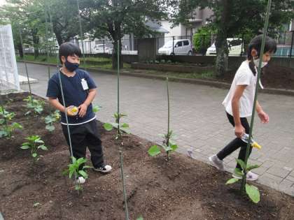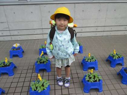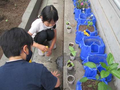 なかよしでは、「まだ芽が出てこない」と教えてくれました。野菜の苗は大きくなりましたね。大切に育てています。