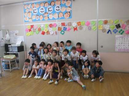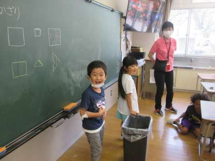 ちょきちょきかざりを作った後は、教室をきれいに掃除していました。そのあと、みんなで作品の前で記念撮影をしていました。いろんなかざりができましたね。