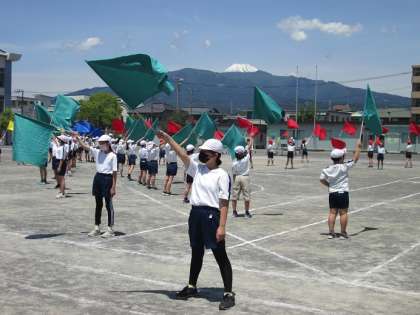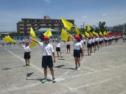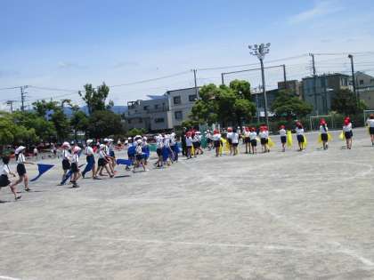 5年生は最後の全体練習です。「夏が始まる、僕らの番だ!」という演技です。青空の下、4色の旗がそろってとてもきれいでした。