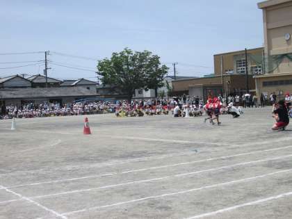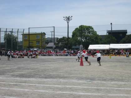 2年生の友だちの輪は、つなげられた2個のフラフープの中に入って走ります。この競技も2人の息を合わせないとなかなかうまくカラーコーンの回ることができません。振り回される子もいましたが、必死に回っていました。