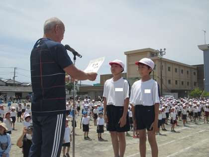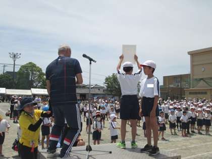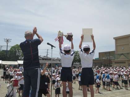 優勝した白組に校長先生から優勝カップと賞状が手渡されました。