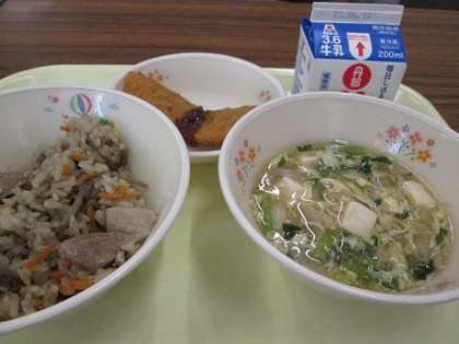 今日の献立は、「豚肉の炊き込みご飯 牛乳 かますフライ かきたま汁」でした。1年生から5年生までは給食があり、みんなで美味しくいただきました。ごちそうさまでした。