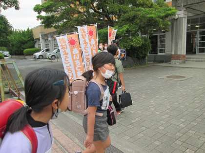 委員会のあいさつ運動の旗も立ちました。みなさん、元気よくあいさつをして気持ちのよい一日のスタートにしましょう。