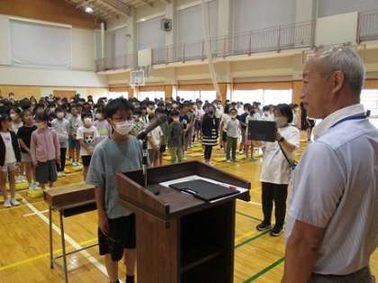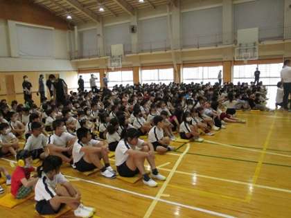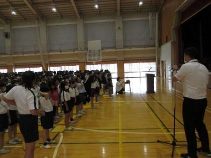 本日、6月度の朝会を体育館をメイン会場にオンラインで各教室をつなぎ実施しました。体育館では、3〜5年と仲よし学級の児童が話を聞きました。久しぶりに3学年以上の子どもたちが集い合いました。