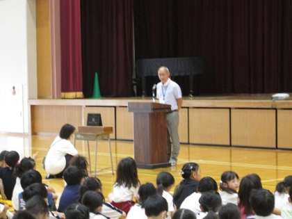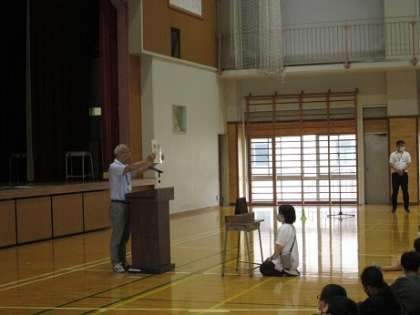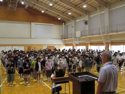 朝のあいさつを交わした後、校長先生が講話をしました。「あいさつは魔法の言葉」と題して、話をしました。
