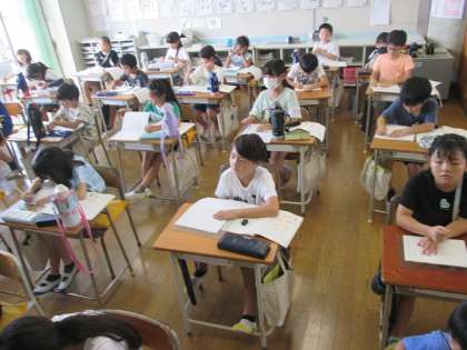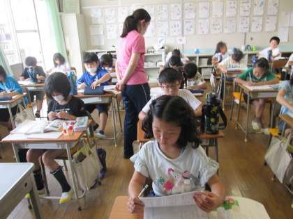 3年4組は国語「考えをまとめよう広げよう」の学習です。途中で「キリンを見る」と「やってみる」の「みる」の違いについて、先生と確認していました。