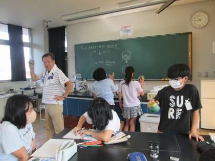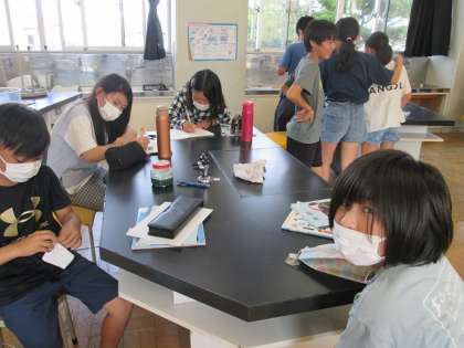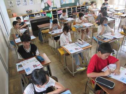 5年3組は理科の「流れる水のはたらき」の学習です。ガラスの容器に、オアシス(吸水スポンジ)を入れて振ります。これで川から石が流れてくるという実験です。オアシスはどうなるのでしょうか。みんな、必死にガラス容器を振っていました。