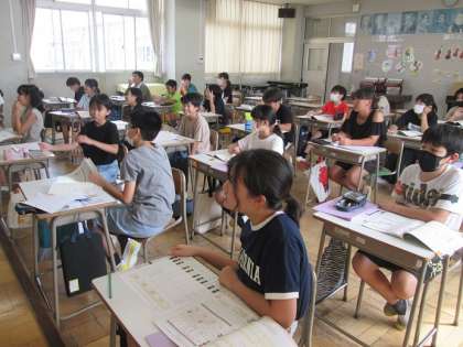 5年4組は音楽「リズムアンサンブルをつくろう」の学習です。「反復(繰り返し)」「強弱」などのキーワードを確認していきました。