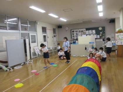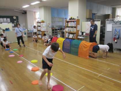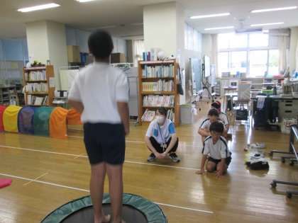 なかよし1〜3組は、日生で「運動」の学習です。運動には細かな運動と大きな運動があります。この日は大きく動かす運動をしていました。体の感覚を確かめながらいろいろな動きをしています。