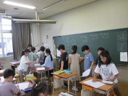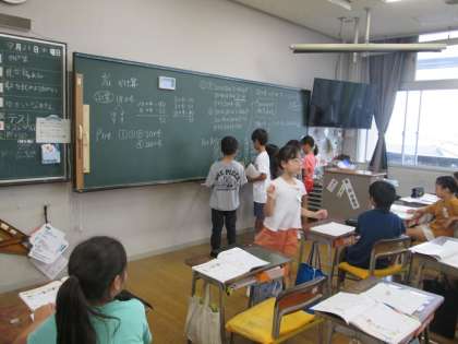 3年2組は算数の「かけ算」です。20×3、300×2などの問題を前に出て解いています。