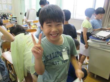3年1組は算数「筆算」のプリントを解いています。3けた×1けたなどの問題ができた子は先生にチェックしてもらいます。マルをもらうととてもうれしそうでした。