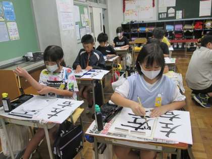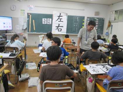 4年4組は書写の毛筆です。「左右」という漢字は似ていますが違います。その違いに気をつけながら練習していました。