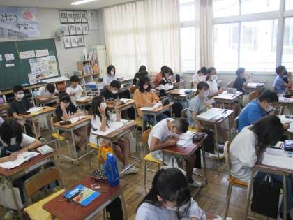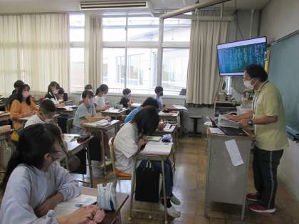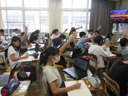 6年3組は国語「きつねの窓」です。文章中からポイントとなる箇所にサイドラインを引いて、引いたわけを発表していました。