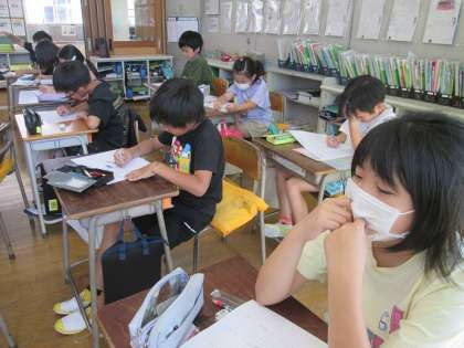 3年1組は算数のかけ算のプリント学習です。3けた×1けたにチャレンジしていました。