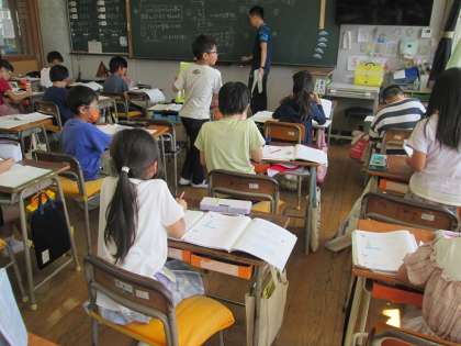 3年2組も算数です。筆算をどうやってやるのかをみんなえ確認しています。位をそろえて計算することに注意しながら取り組んでいました。