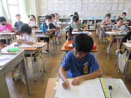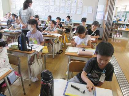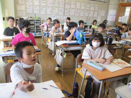 3年4組は算数の学習です。筆算の学習もしていますが暗算でできるものはないかと考えています。24×3を20×3と4×3に分けて計算しています。「これなら100の位になっても暗算でいけそうだよ」という子もいました。頼もしいですね。