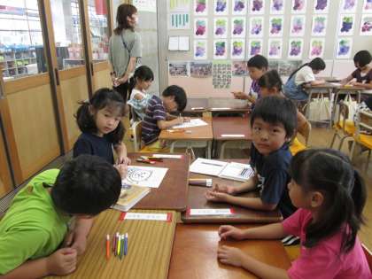 1年1組は国語「ぬりえゲームをしよう」の学習です。先生のお話をよく聞いて、そのとおりにぬり絵に色をぬっていきます。グループで順番に先生のいうことを耳をすませて聞いていました。先生の言ったとおりに色がぬれているかな?