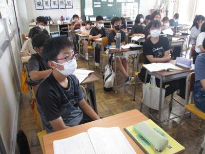 6年3組は国語「きつねの窓」の音読です。「とっぴょうしもないかん高い声で」を声に出して読んでいます。登場人物の気持ちになって音読をしています。