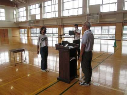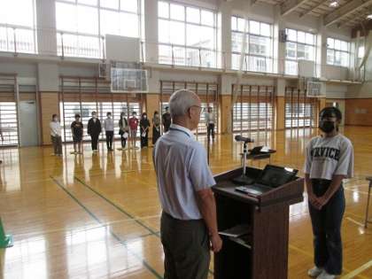 今朝、10月度の朝会を体育館を主会場にオンラインで行いました。最初に企画委員長さんの発声で校長先生と朝のあいさつを交わしました。