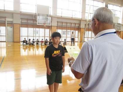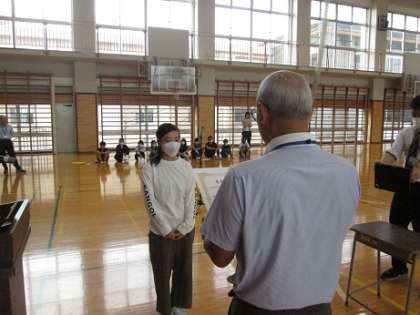 校長先生と朝のあいさつを交わした後、表彰を行いました。沼津市理科研究作品展で優秀な成績を収めた子の表彰と沼津文園に出品された子の代表表彰でした。沼津文園の表彰は、各学級でも行われました。