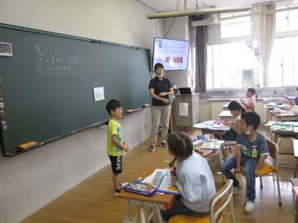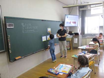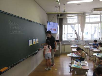 前に出て、自分の考えをクラスのみんなに説明しています。「同じです」「いいと思います」など聞き方も上手でした。