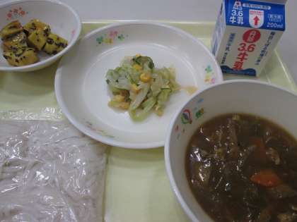 今日の給食は、カレー南蛮、ボイルドサラダ、大学芋、牛乳です。