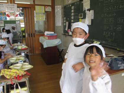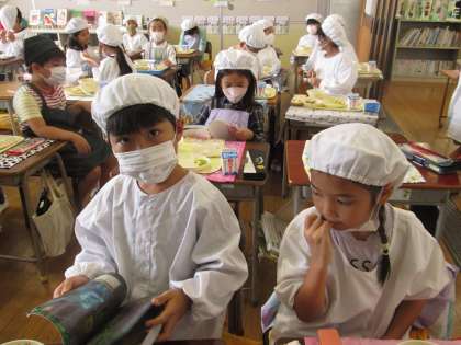 2年生の給食の様子を紹介します。2年1組は「いただきます」をするところでした。支度のできた子は静かに読書をして待っています。「早い!もう給食食べたの?」と声を掛けてくれました。「だって、校長先生は試しで食べるんでしょ?」と言ってくれた子がいました。検食というお仕事なんですよ。