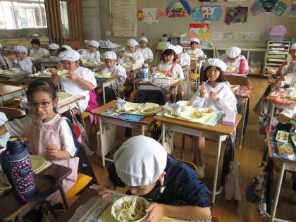 2年2組で、「カレーを給食着に付けないでね。お洗濯大変だよって怒られちゃうよ」と言うと、「大丈夫。うちのお母さんは優しいから」と。そうだよね。汚してもいいように給食着を着てるんだもんね!