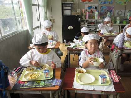2年生も食欲旺盛です。カレー南蛮も「何にもからくないよ!へっちゃら!」とおいしそうに食べていました。