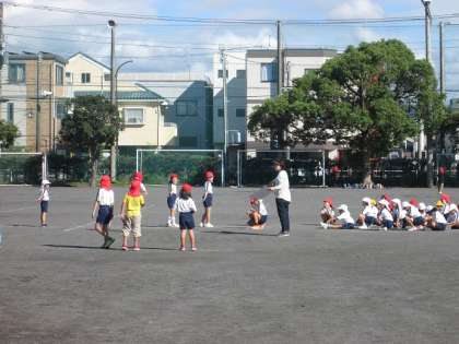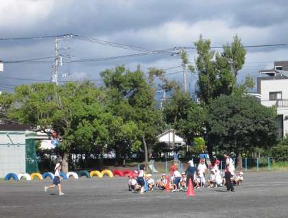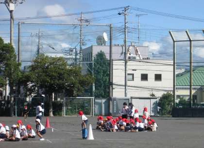 2年生は体育で全クラスリレーの練習です。どのクラスも一生懸命バトンの練習をしています。