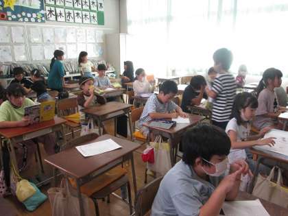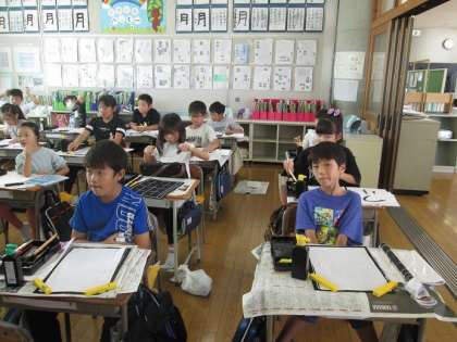 3年2組は書写の毛筆です。「つり」という字にチャレンジしています。はらいやはねに気をつけながら練習に取り組みました。